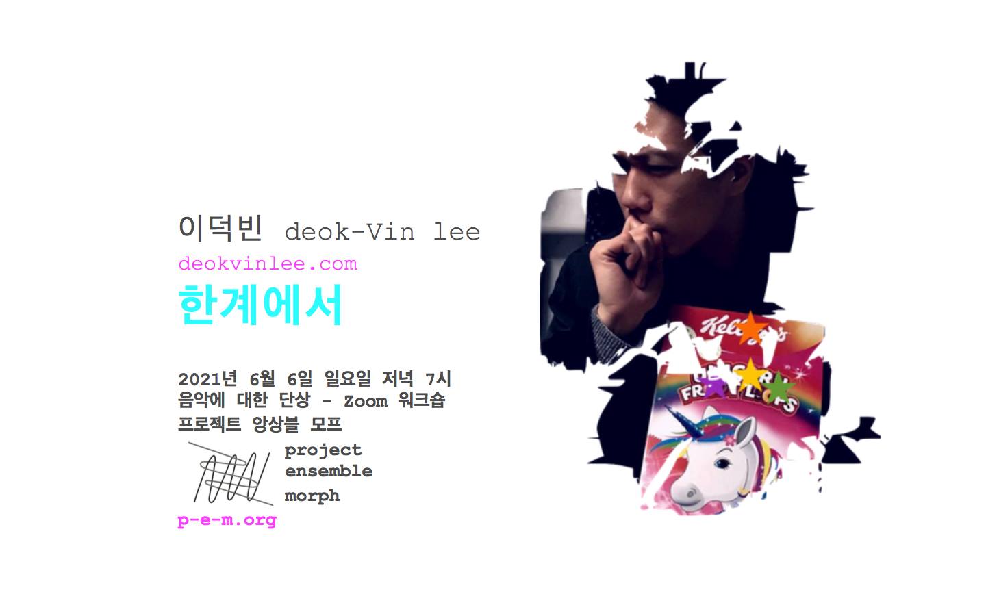 Project ensemble morph는 8월 22일 서울에서 있을 연주회 <빈 곳의 바깥에서, 다시>를 위해 6월과 7월 사이 네 번에 걸쳐 온라인 워크샵을 진행했습니다. 이 워크샵에서는 작곡가와 연주자가 자신의 작업을 소개하는 시간을 가졌습니다. 다음의 글은 2021년 6월 6일 저녁 7시에 있었던 작곡가 이덕빈의 워크샵 <한계에서>의 내용 중 일부를 발췌해 편집한 것입니다.